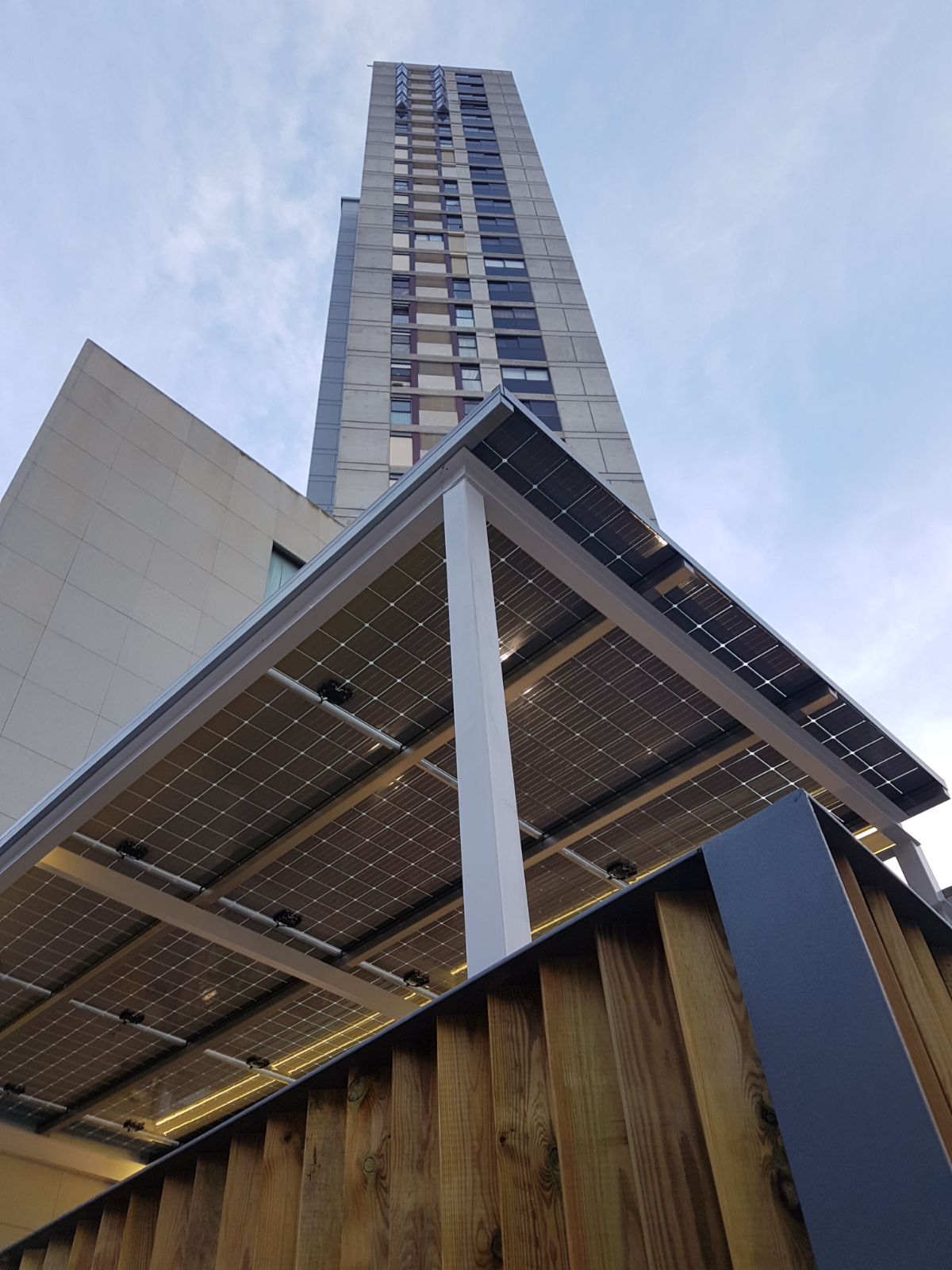 Tras un rediseño, esta pérgola fotovoltaica es una solución innovadora que logra generar más de 11.000 kwh. Esta pérgola es la primera en utilizar los paneles solares de vidrio translúcido sin marco perimetral de aluminio, los cuales se integran perfectamente con el diseño de la oficina